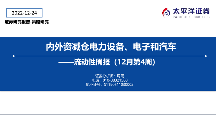 【太平洋证券】【20221224】流动性周报(12月第4周):内外资减仓电力设备、电子和汽车-19页
