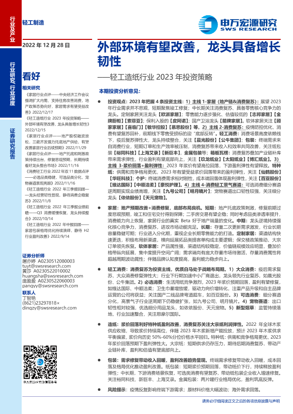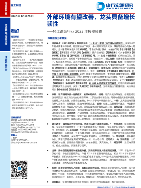 【申万宏源】【20221228】轻工造纸行业2023年投资策略:外部环境有望改善,龙头具备增长韧性-97页