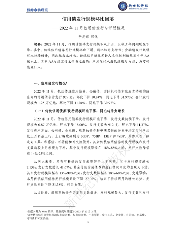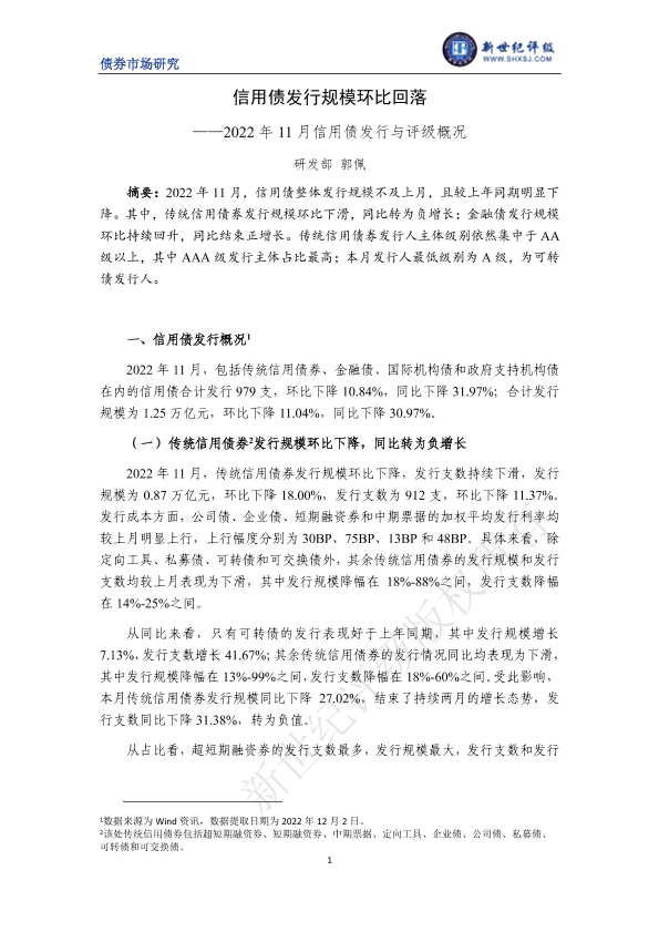【新世纪评级】【202212】信用债发行规模环比回落——2022年11月信用债发行与评级概况-7页