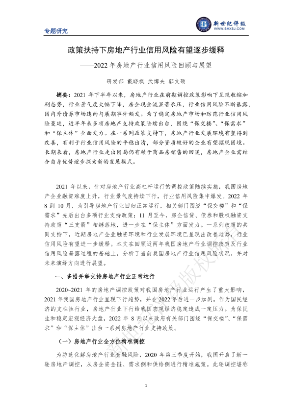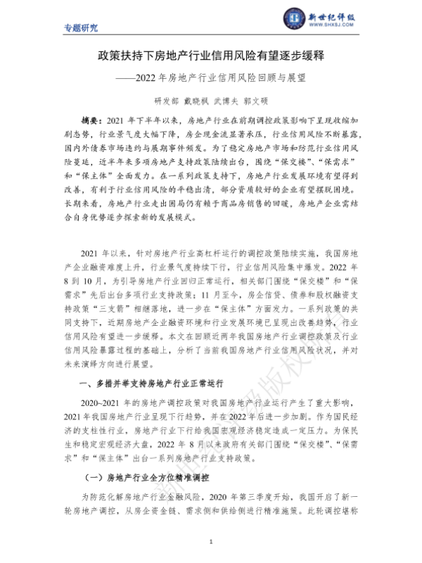 【新世纪评级】【2022】政策扶持下房地产行业信用风险有望逐步缓释——2022年房地产行业信用风险回顾与展望-12页