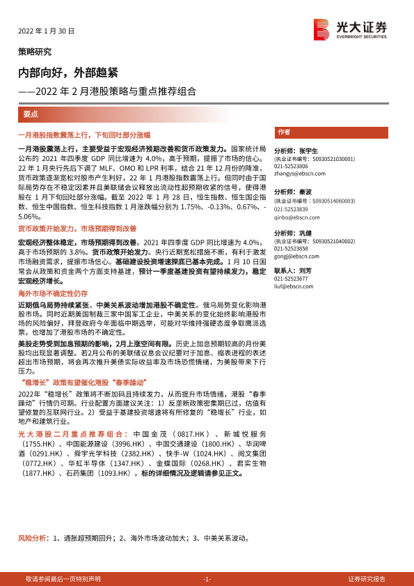 【光大证券】【20220130】2022年2月港股策略与重点推荐组合:内部向好,外部趋紧-21页