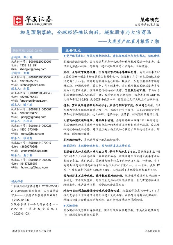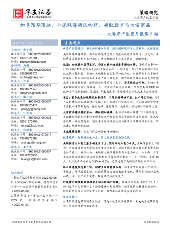 【华安证券】【20220209】大类资产配置月报第7期:加息预期落地,全球经济确认向好,超配股市与大宗商品-20页