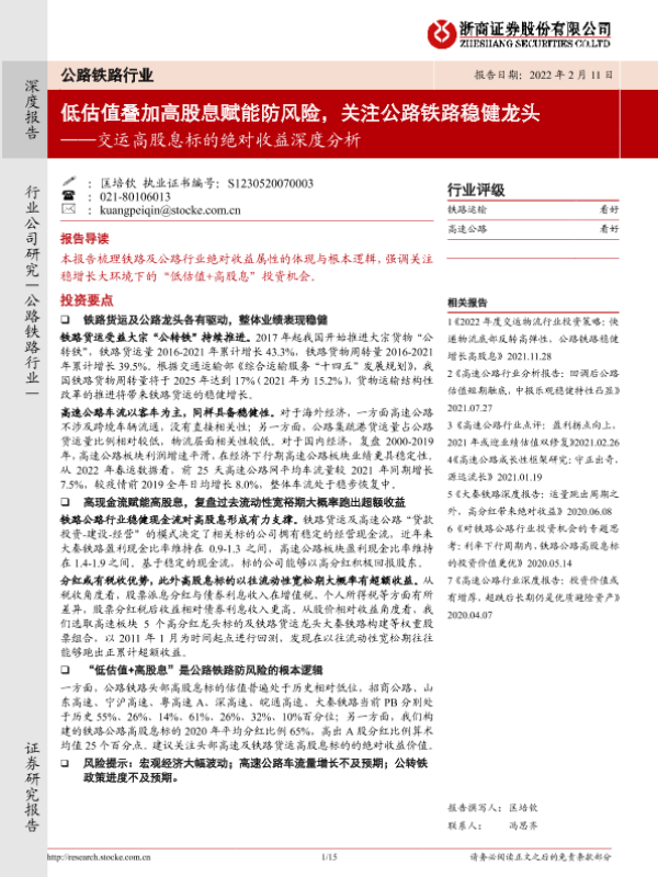 【浙商证券】【20220211】公路铁路行业交运高股息标的绝对收益深度分析:低估值叠加高股息赋能防风险,关注公路铁路稳健龙头-15页