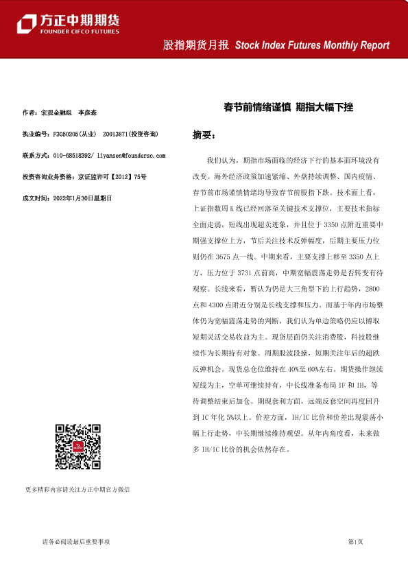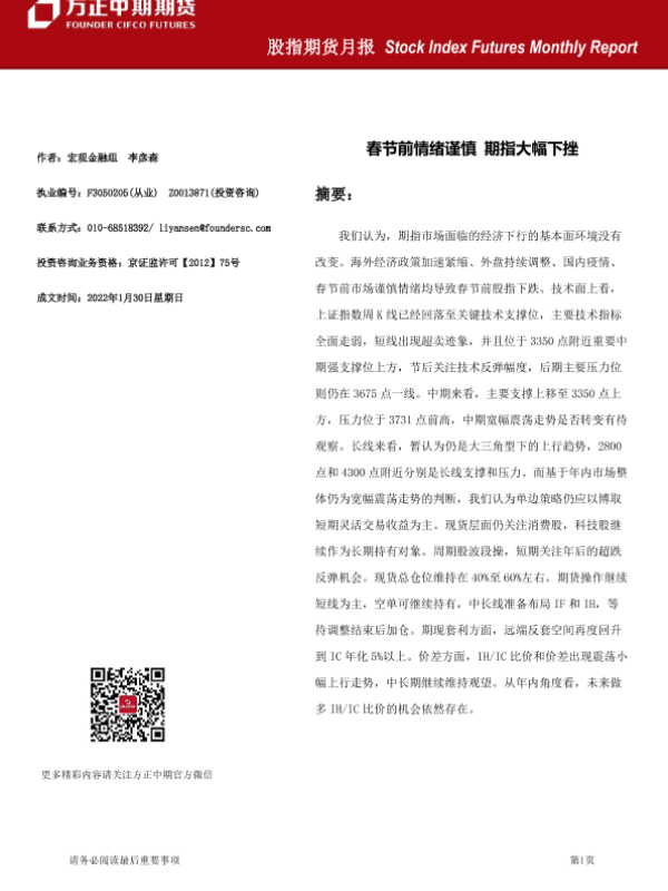 【方正中期期货】【20220130】股指期货月报:春节前情绪谨慎,期指大幅下挫-33页