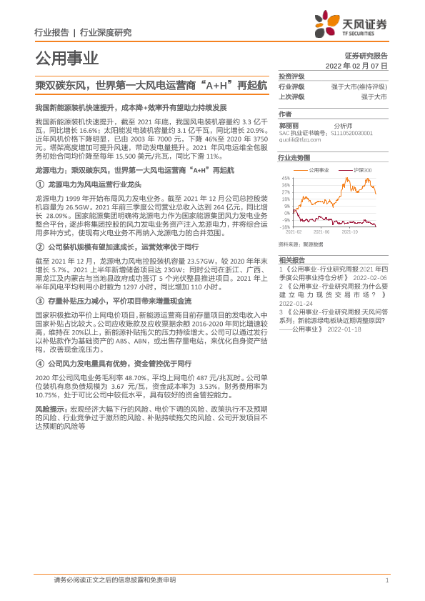 【天风证券】【20220207】公用事业行业深度研究:乘双碳东风,世界第一大风电运营商“A+H”再起航-23页