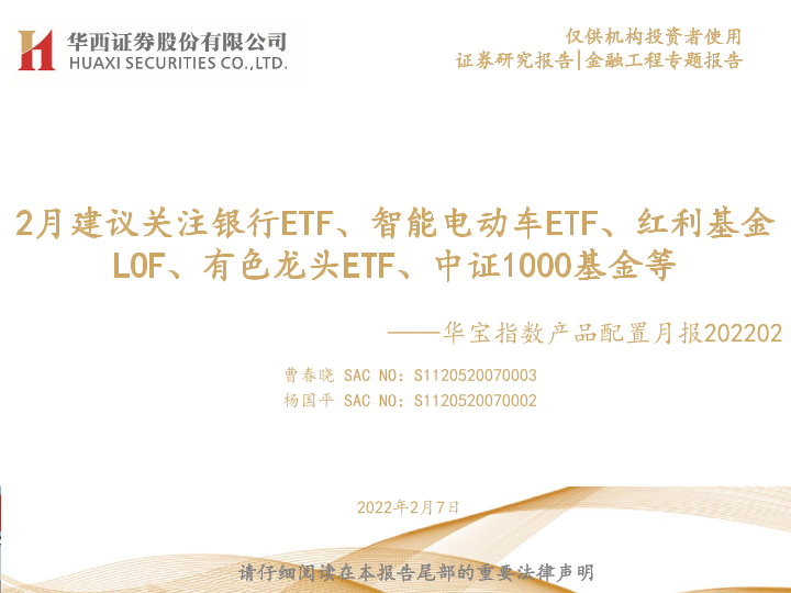 【华西证券】【20220207】华宝指数产品配置月报:2月建议关注银行ETF、智能电动车ETF、红利基金LOF、有色龙头ETF、中证1000基金等-24页