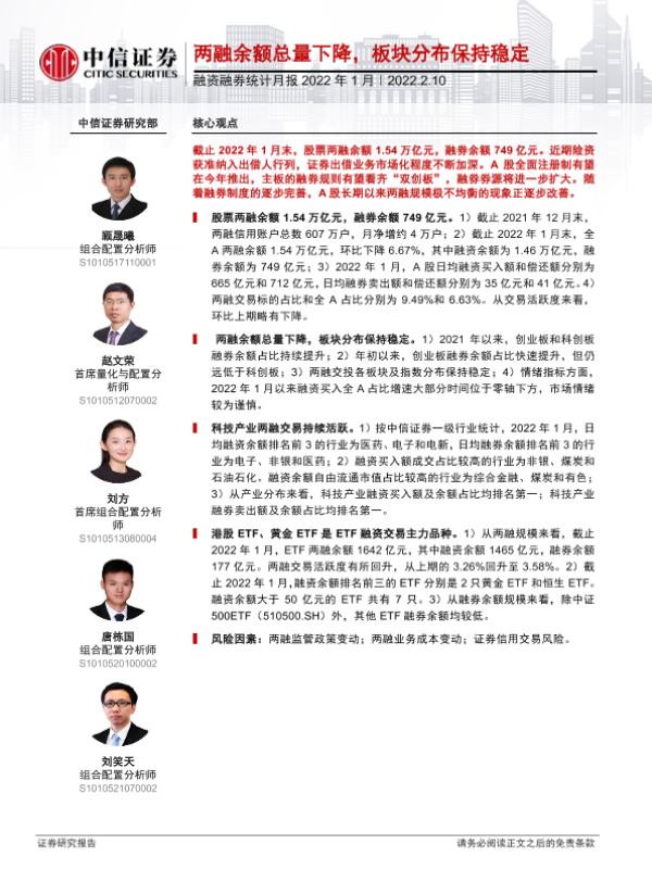 【中信证券】【20220210】融资融券统计月报2022年1月:两融余额总量下降,板块分布保持稳定-15页