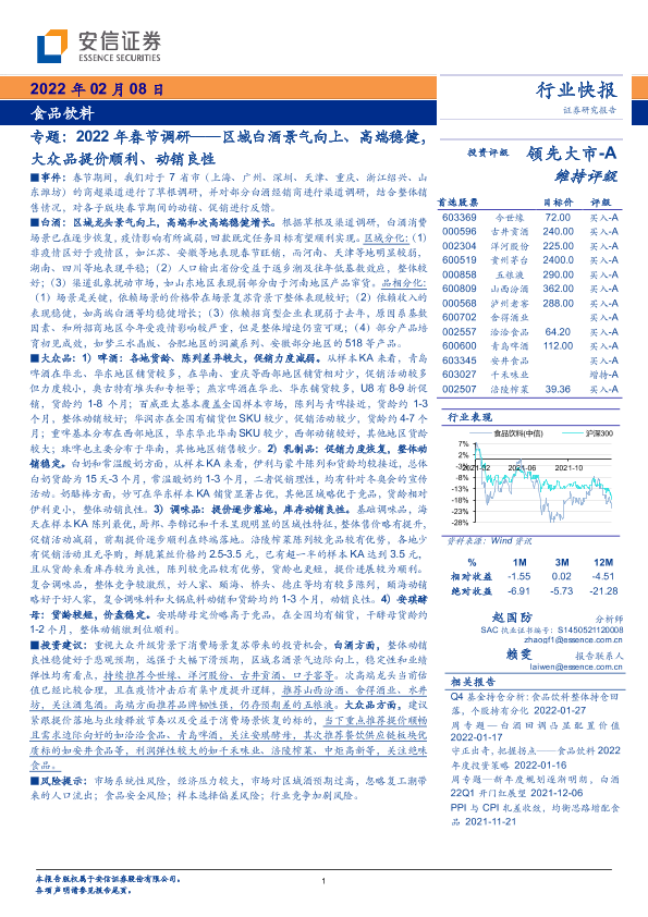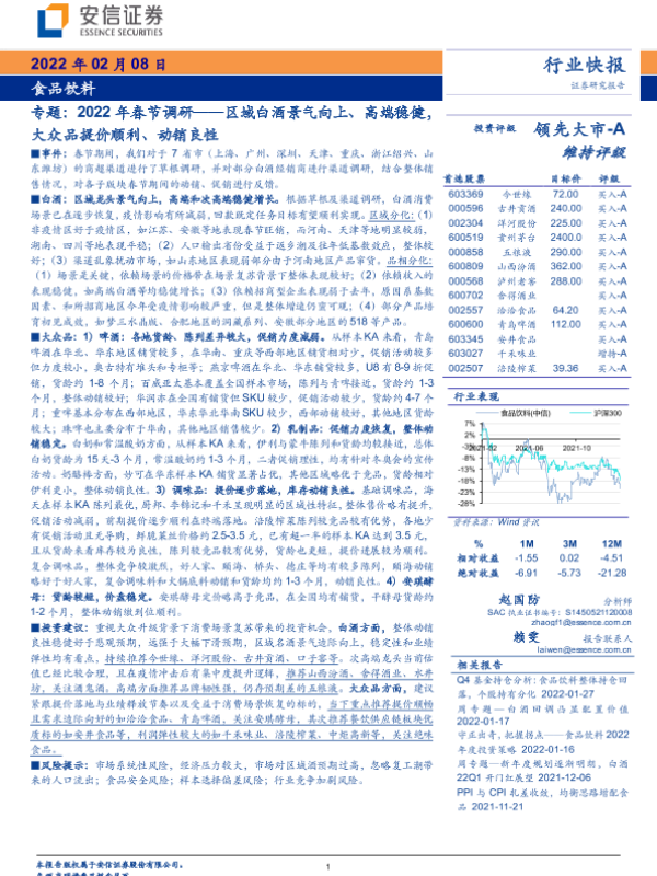 【安信证券】【20220208】食品饮料行业专题:2022年春节调研-区域白酒景气向上、高端稳健,大众品提价顺利、动销良性-19页