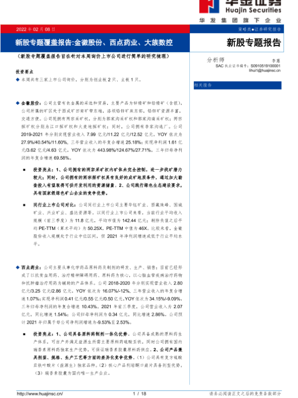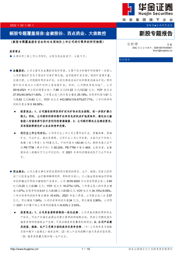 【华金证券】【20220208】新股专题覆盖报告 金徽股份、西点药业、大族数控-18页
