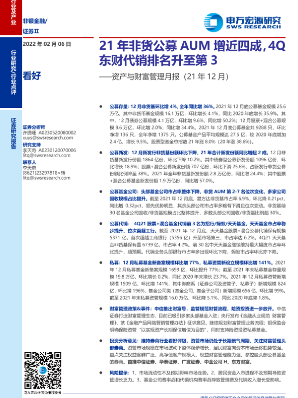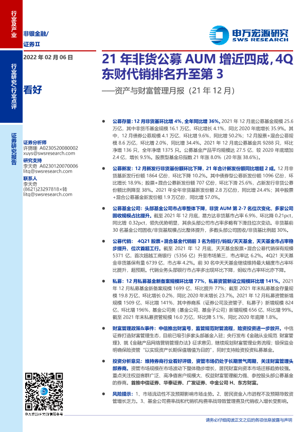 【申万宏源】【20220206】证券行业资产与财富管理月报:21年非货公募AUM增近四成,4Q东财代销排名升至第3-21页