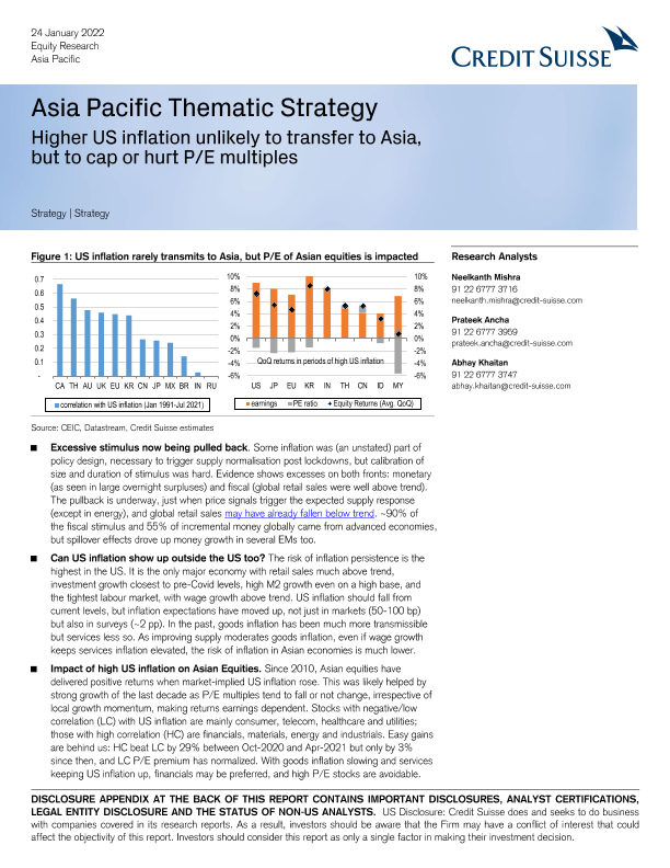 【瑞信(Credit Suisse)】【20220124】瑞信-亚太地区投资策略-美国的高通胀不太可能转移到亚洲,但会限制或损害市盈率-28页