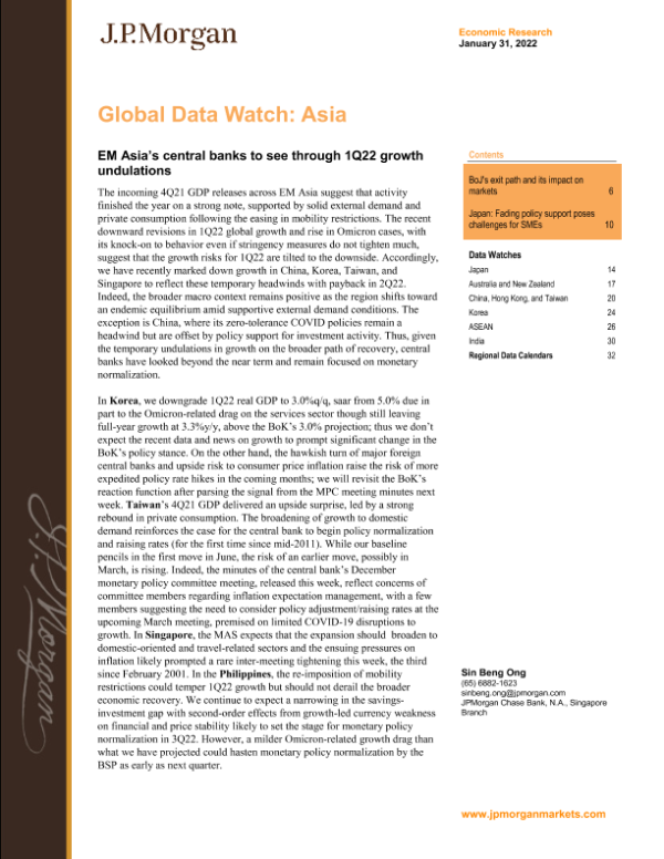 【J.P. Morgan】【20220131】J.P. 摩根-亚太地区投资策略-新兴市场亚洲各国央行将看穿2022年第一季度的增长波动-36页