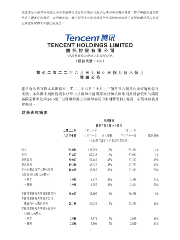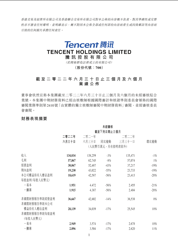 2022 业绩公告 第二季度 腾讯 财务报告