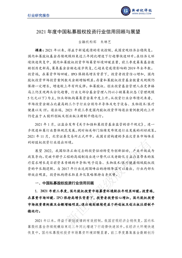 【新世纪评级】【2021】2021年度中国私募股权投资行业信用回顾与展望-14页