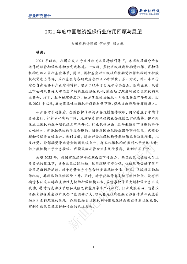 【新世纪评级】【2021】2021年度中国融资担保行业信用回顾与展望-25页
