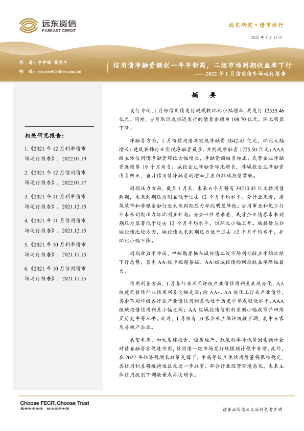【远东资信】【20220215】2022年1月信用债市场运行报告:信用债净融资额创一年半新高,二级市场到期收益率下行-20页