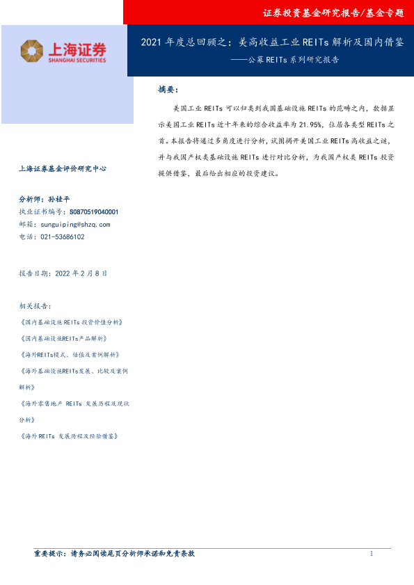 【上海证券】【20220208】公募REITs系列研究报告:2021年度总回顾之,美高收益工业REITs解析及国内借鉴-23页
