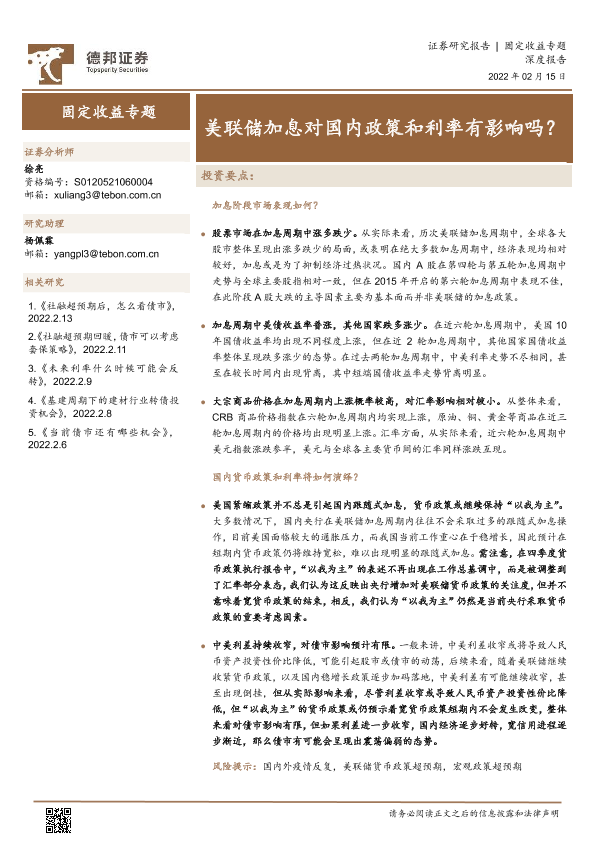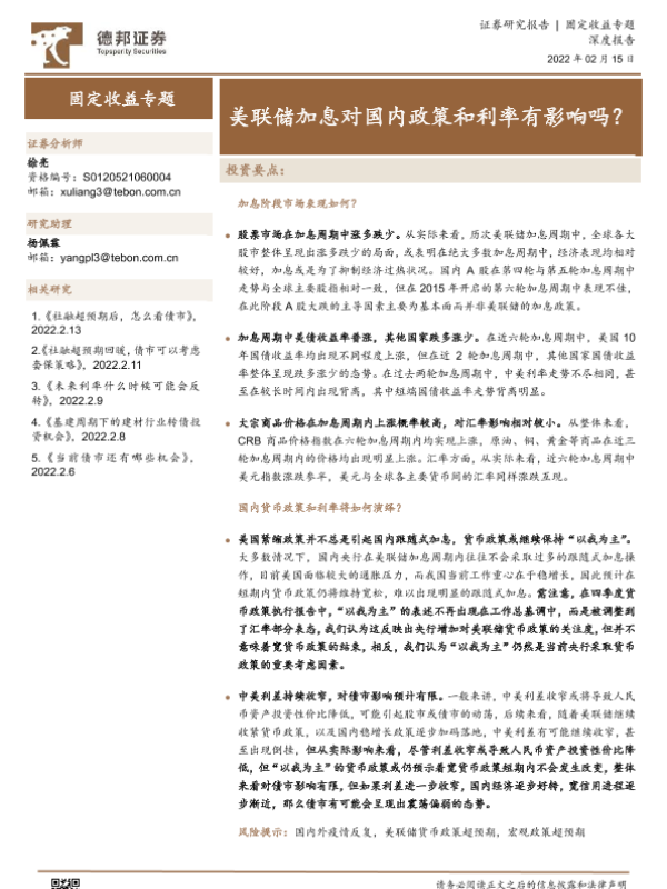 【德邦证券】【20220215】固定收益专题:美联储加息对国内政策和利率有影响吗?-15页