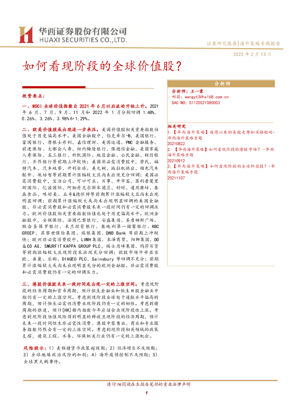 【华西证券】【20220213】海外策略专题报告:如何看现阶段的全球价值股?-18页