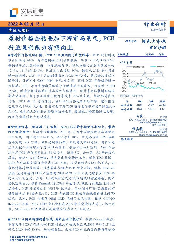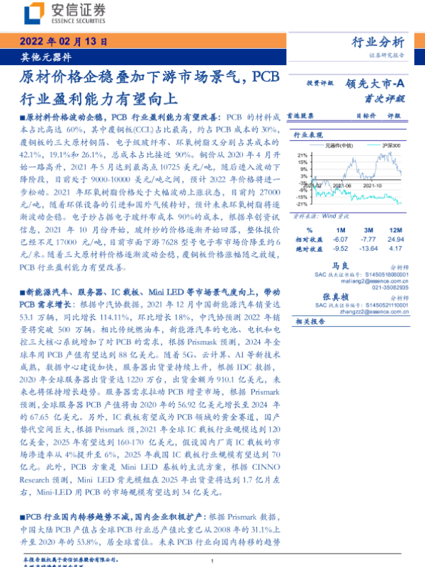 【安信证券】【20220213】其他元器件行业:原材价格企稳叠加下游市场景气,PCB行业盈利能力有望向上-22页