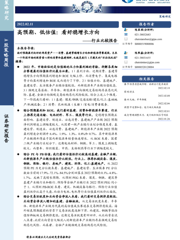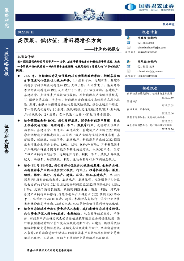【国泰君安证券】【20220211】高预期、低估值:看好稳增长方向——行业比较报告-15页