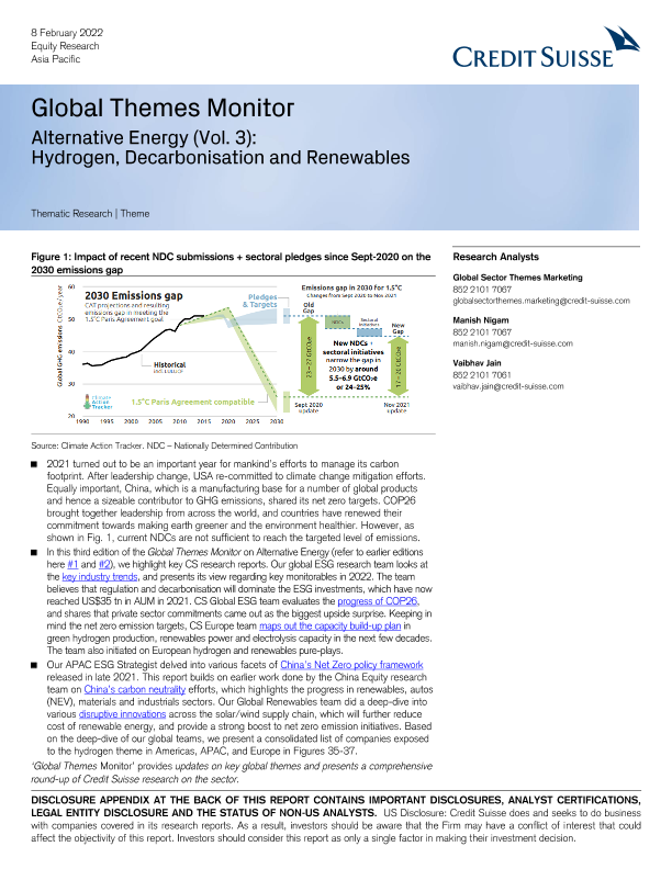 【Credit Suisse】【20220208】瑞信-亚太地区投资策略-替代能源:氢,脱碳和可再生能源-24页