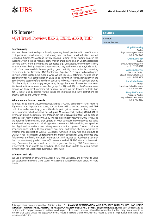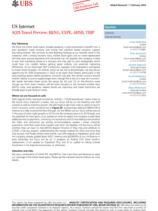 【瑞银】【20220207】瑞银-美股互联网行业-2021年第四季度旅行预览:BKNG、EXPE、ABNB、TRIP-32页