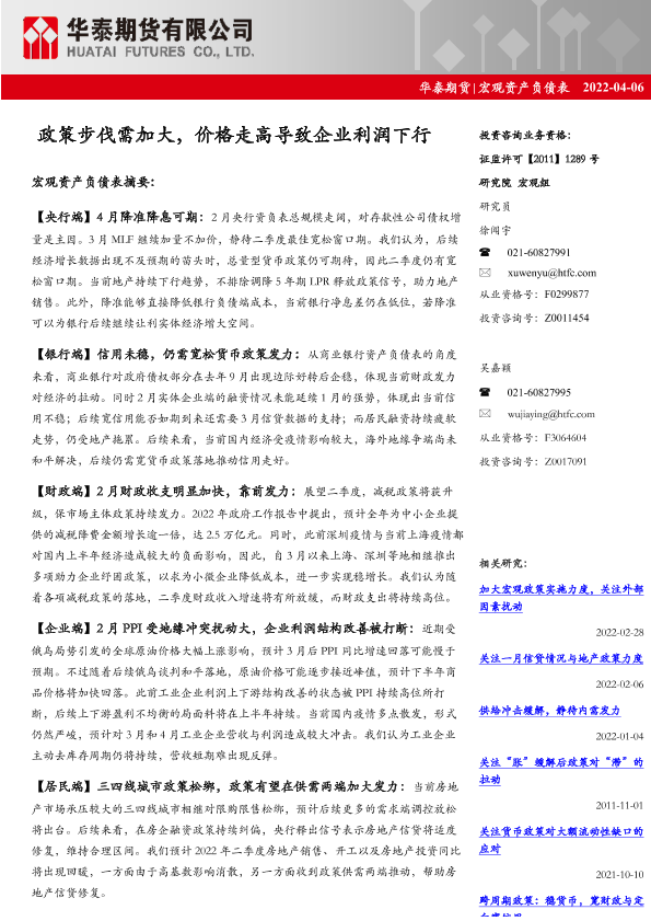 【华泰期货】【20220406】宏观资产负债表:政策步伐需加大,价格走高导致企业利润下行-26页