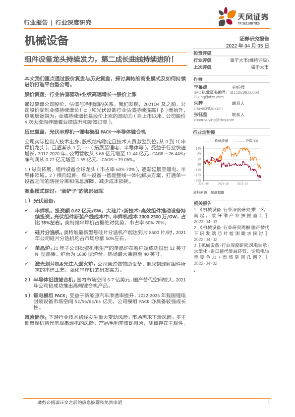 【天风证券】【20220405】机械设备行业:组件设备龙头持续发力,第二成长曲线持续进阶!-32页