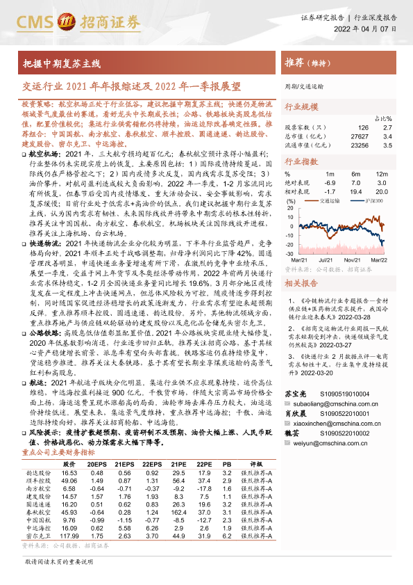 【海通证券】【20220407】交运行业2021年年报综述及2022年一季报展望:把握中期复苏主线-21页
