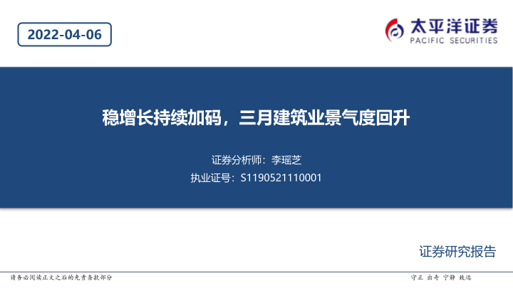 【太平洋证券】【20220406】建筑行业:稳增长持续加码,三月建筑业景气度回升-20页