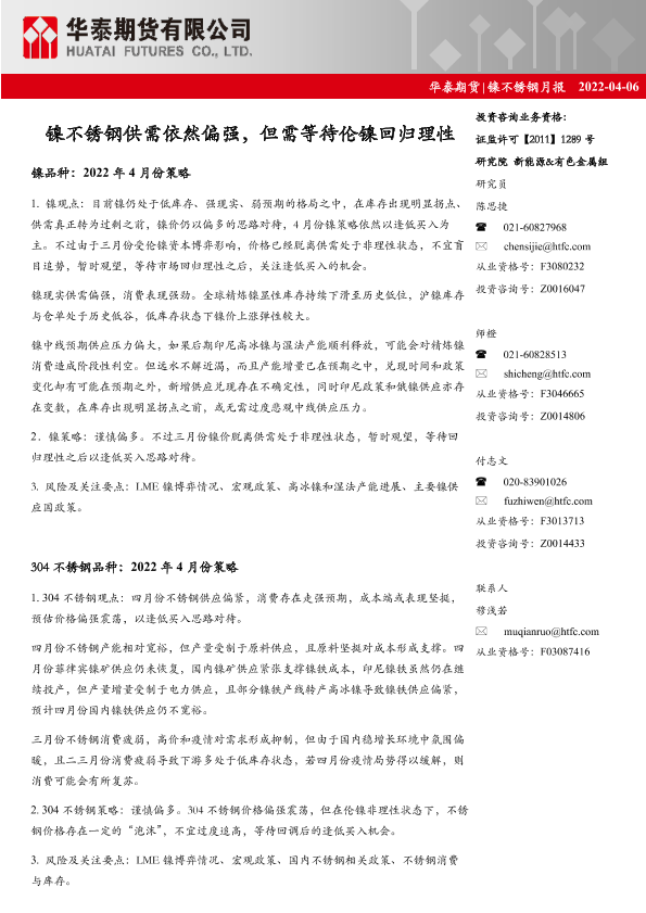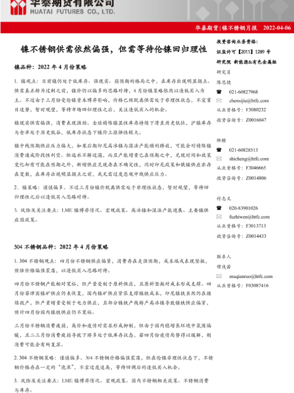 【华泰期货】【20220406】镍不锈钢月报:镍不锈钢供需依然偏强,但需等待伦镍回归理性-25页
