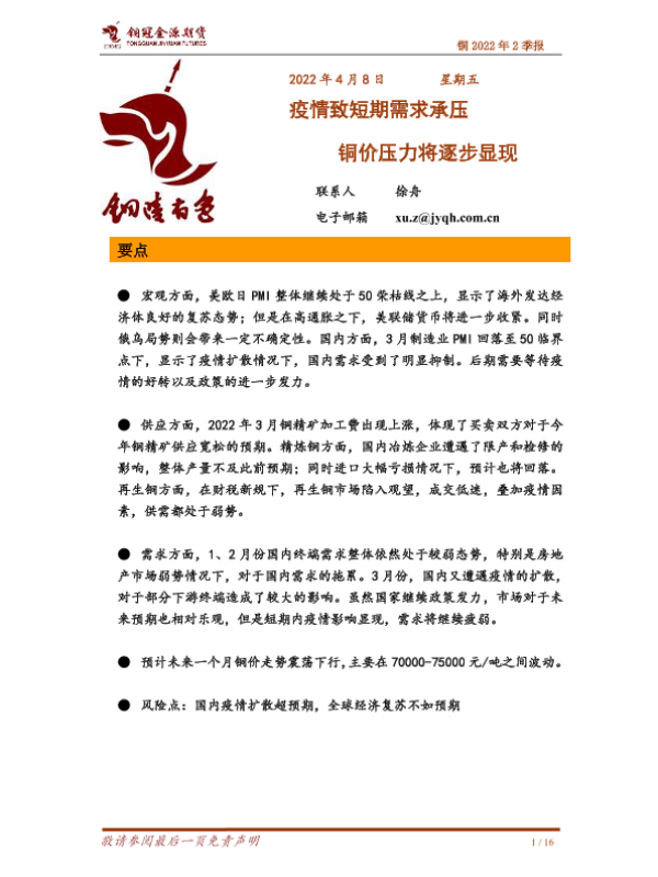 【铜冠金源期货】【20220408】铜2022年2季报:疫情致短期需求承压,铜价压力将逐步显现-16页
