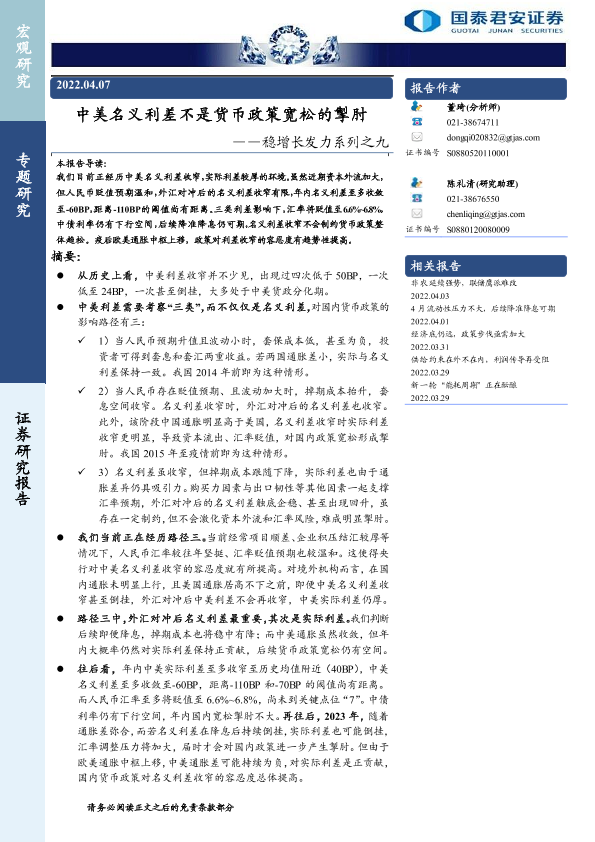 【国泰君安证券】【20220407】稳增长发力系列之九:中美名义利差不是货币政策宽松的掣肘-22页