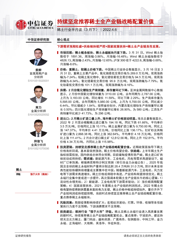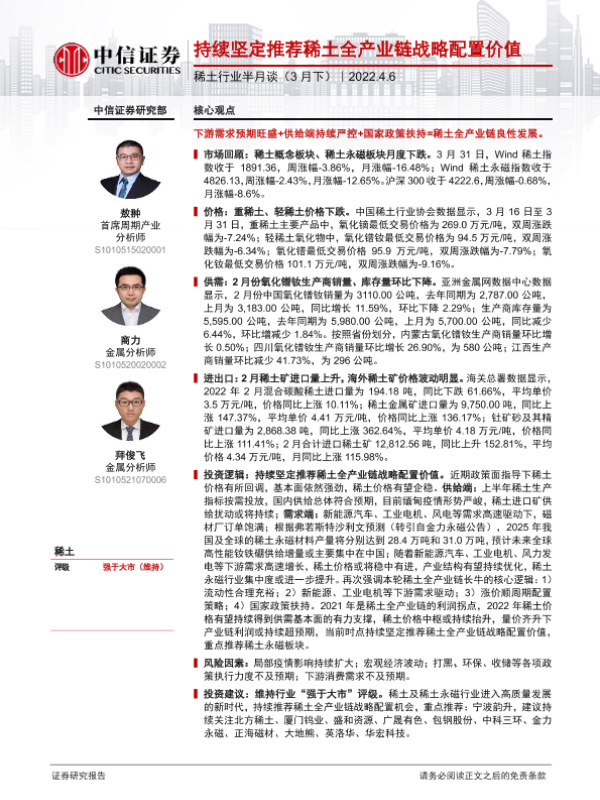 【中信证券】【20220406】稀土行业半月谈(3月下):持续坚定推荐稀土全产业链战略配置价值-35页