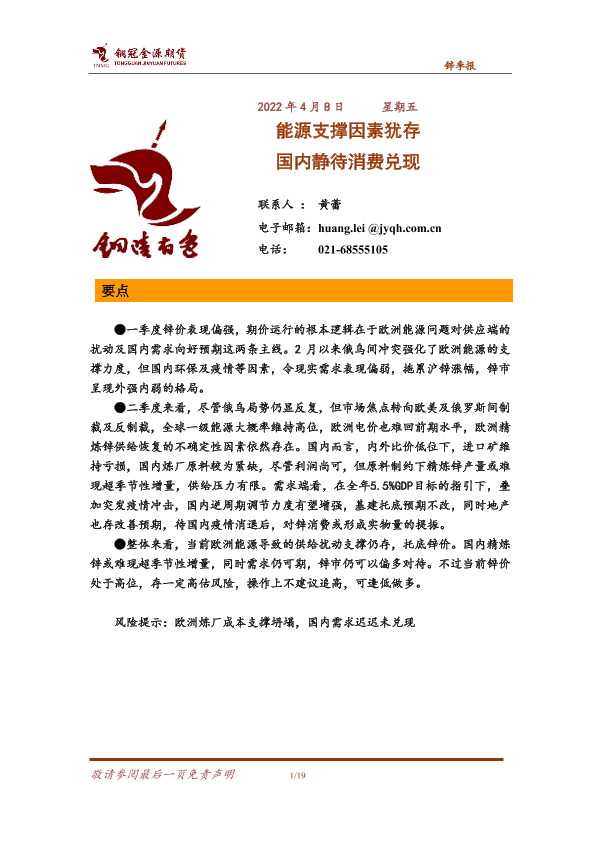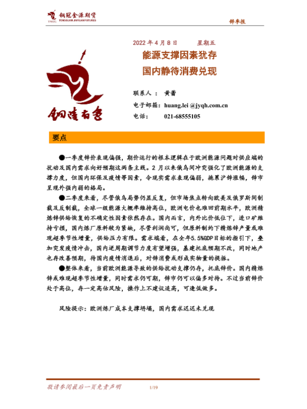 【铜冠金源期货】【20220408】锌季报:能源支撑因素犹存,国内静待消费兑现-19页