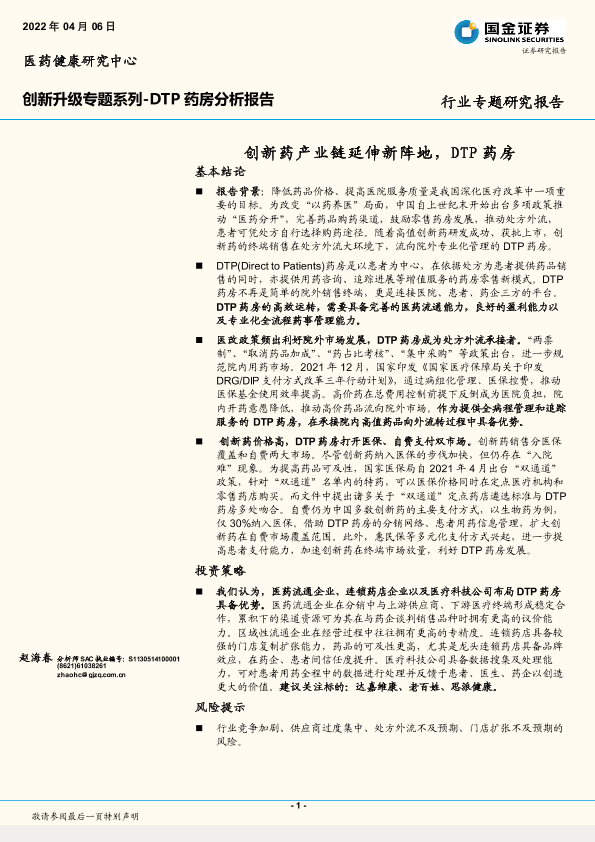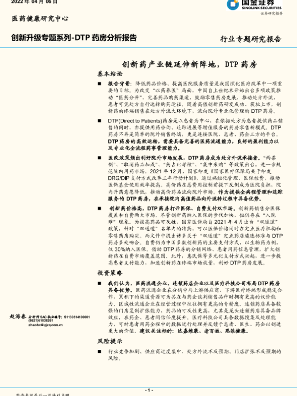 【国金证券】【20220406】医药健康行业创新升级专题系列_DTP药房分析报告:创新药产业链延伸新阵地,DTP药房-24页