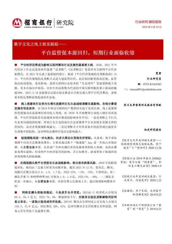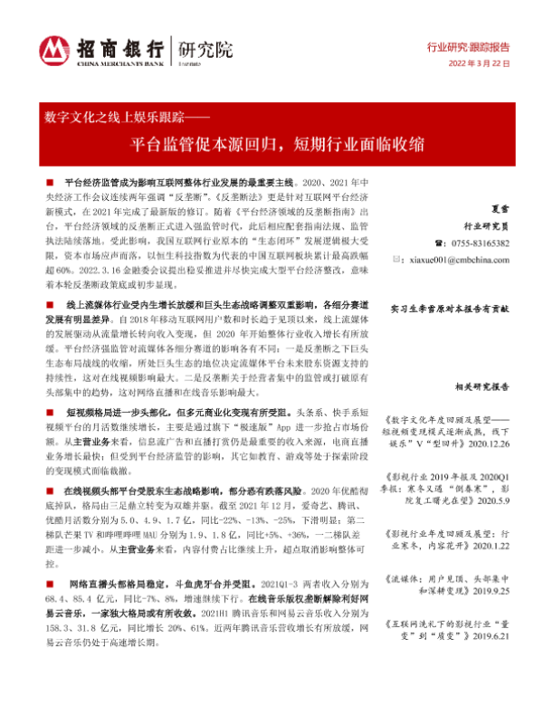 【招商银行】【20220322】数字文化之线上娱乐跟踪——平台监管促本源回归,短期行业面临收缩-24页