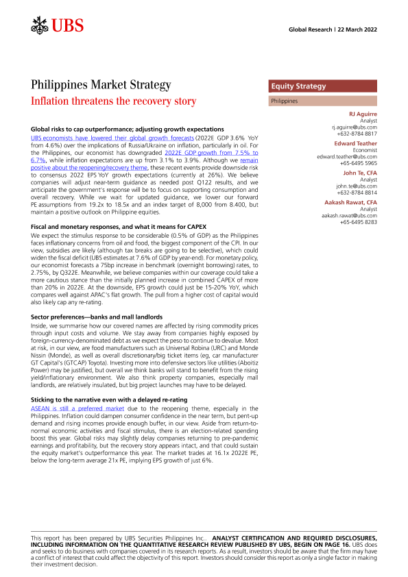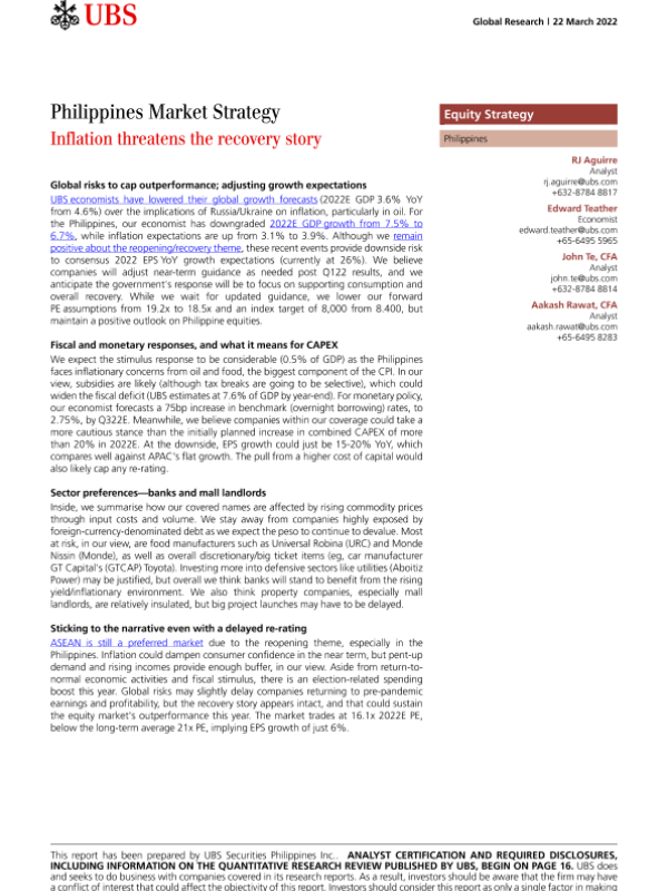 【瑞银】【20220322】瑞银-亚太地区投资策略-菲律宾:通货膨胀威胁着经济复苏-21页
