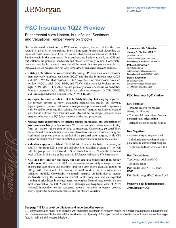 【J.P. Morgan】【20220401】J.P. 摩根-美股保险行业-基本面观点乐观,但通胀、情绪和估值会影响对股市的看法-116页
