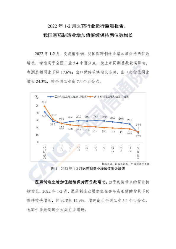 【中国信通院信息化与工业化融合研究所】【2022】2022年1-2月医药行业运行监测报告:我国医药制造业增加值继续保持两位数增长-3页