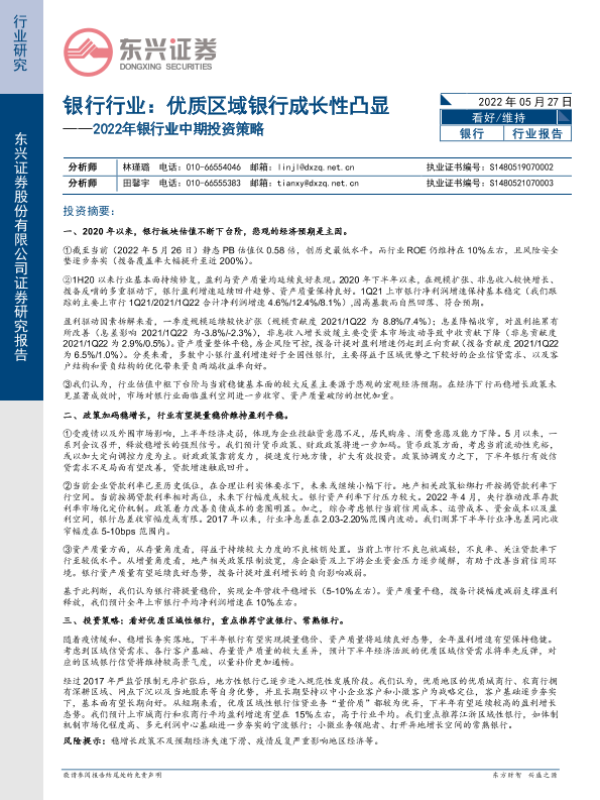 【东兴证券】【20220527】2022年银行业中期投资策略:银行行业,优质区域银行成长性凸显-21页