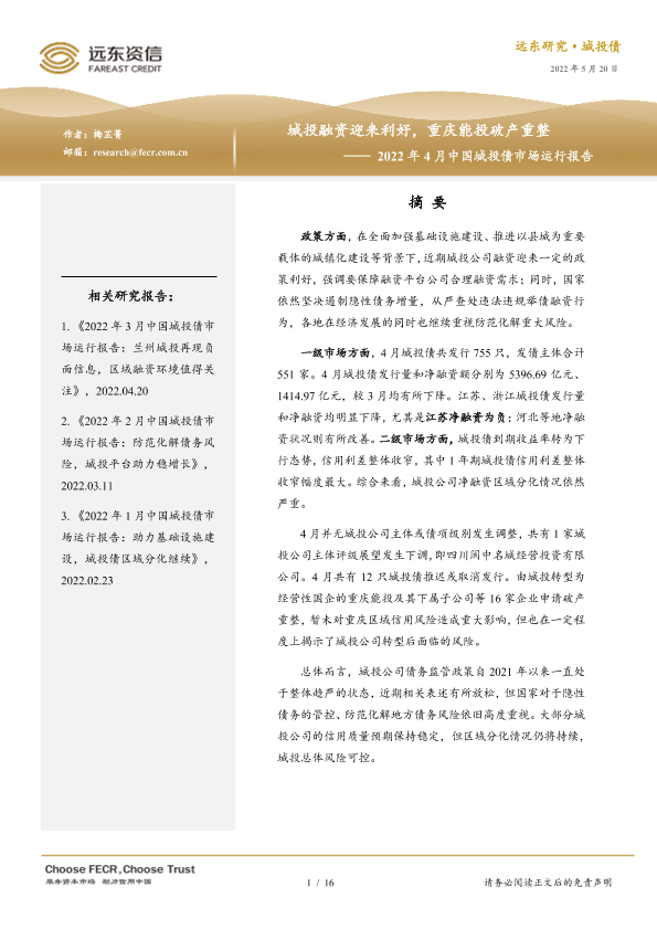 【远东资信】【20220520】2022年4月中国城投债市场运行报告:城投融资迎来利好,重庆能投破产重整-16页