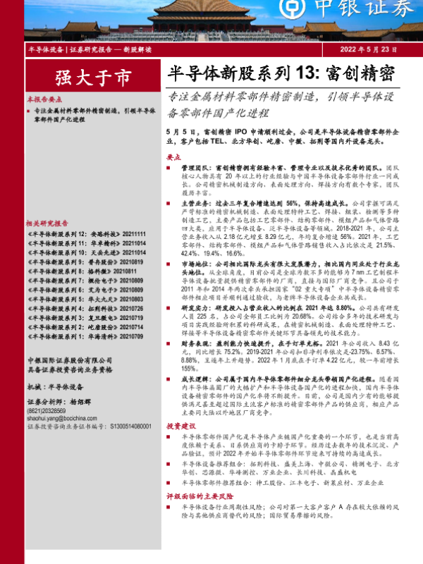 【中银证券】【20220523】半导体行业新股系列13:富创精密,专注金属材料零部件精密制造,引领半导体设备零部件国产化进程-31页