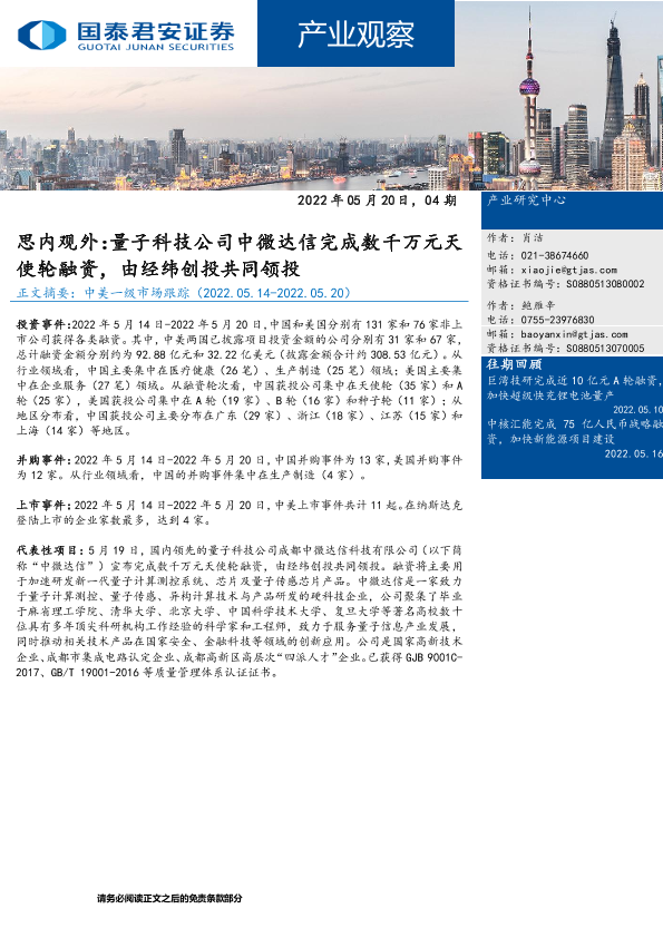 【国泰君安证券】【20220520】产业观察:思内观外,量子科技公司中微达信完成数千万元天使轮融资,由经纬创投共同领投-26页