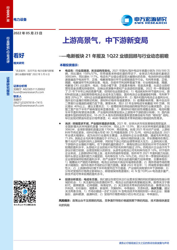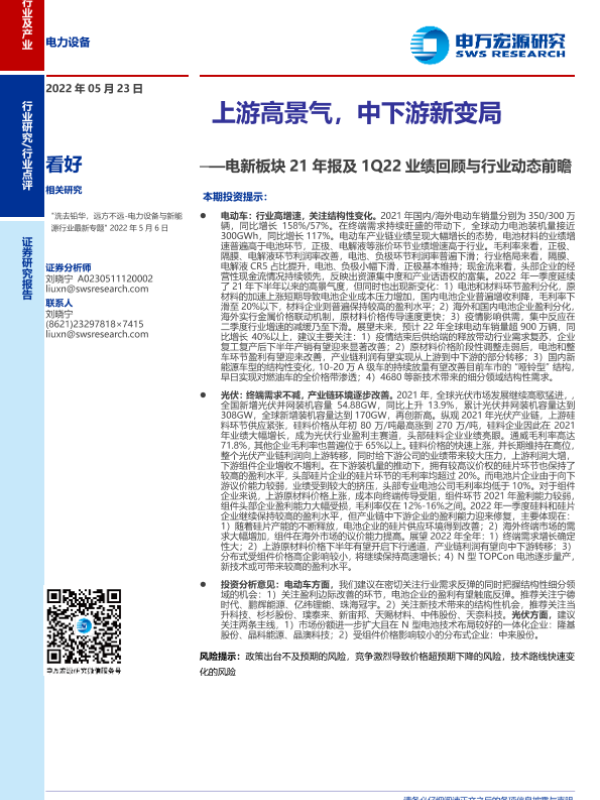 【申万宏源】【20220523】电力设备行业电新板块21年报及1Q22业绩回顾与行业动态前瞻:上游高景气,中下游新变局-26页