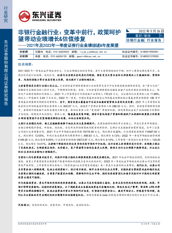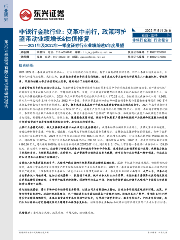 【东兴证券】【20220526】非银金融行业2021年及2022年一季度证券行业业绩综述&年度展望:变革中前行,政策呵护望带动业绩增长&估值修复-22页