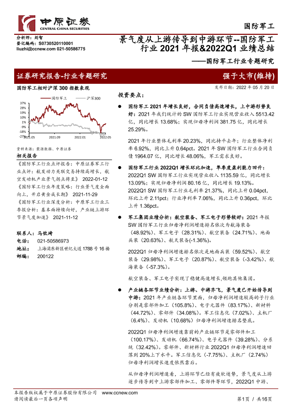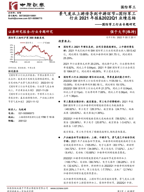 【中原证券】【20220520】国防军工行业专题研究:国防军工行业2021年报&2022Q1业绩总结,景气度从上游传导到中游环节-16页