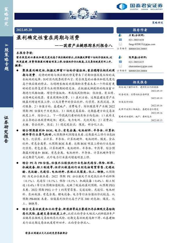 【国泰君安证券】【20220520】国君产业链跟踪系列报告八:盈利确定性重在周期与消费-16页