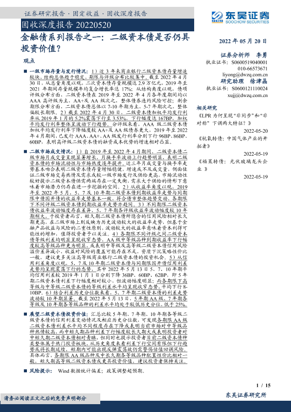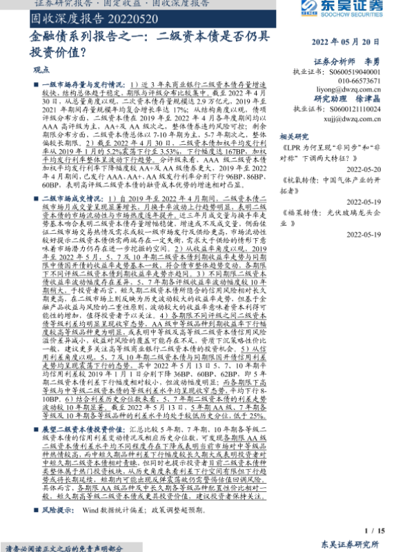 【东吴证券】【20220520】金融债系列报告之一:二级资本债是否仍具投资价值?-15页